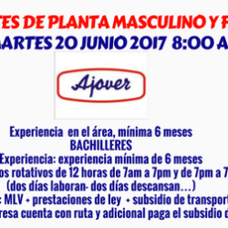 Comparte...AYUDANTES DE PLANTA MASCULINO Y FEMENINO CONVOCA: AYUDANTES DE PLANTA MASCULINO Y FEMENINO MARTES 20 JUNIO 8:00 AM PRESENTARSE CON HOJA DE VIDA Y CEDULA […]